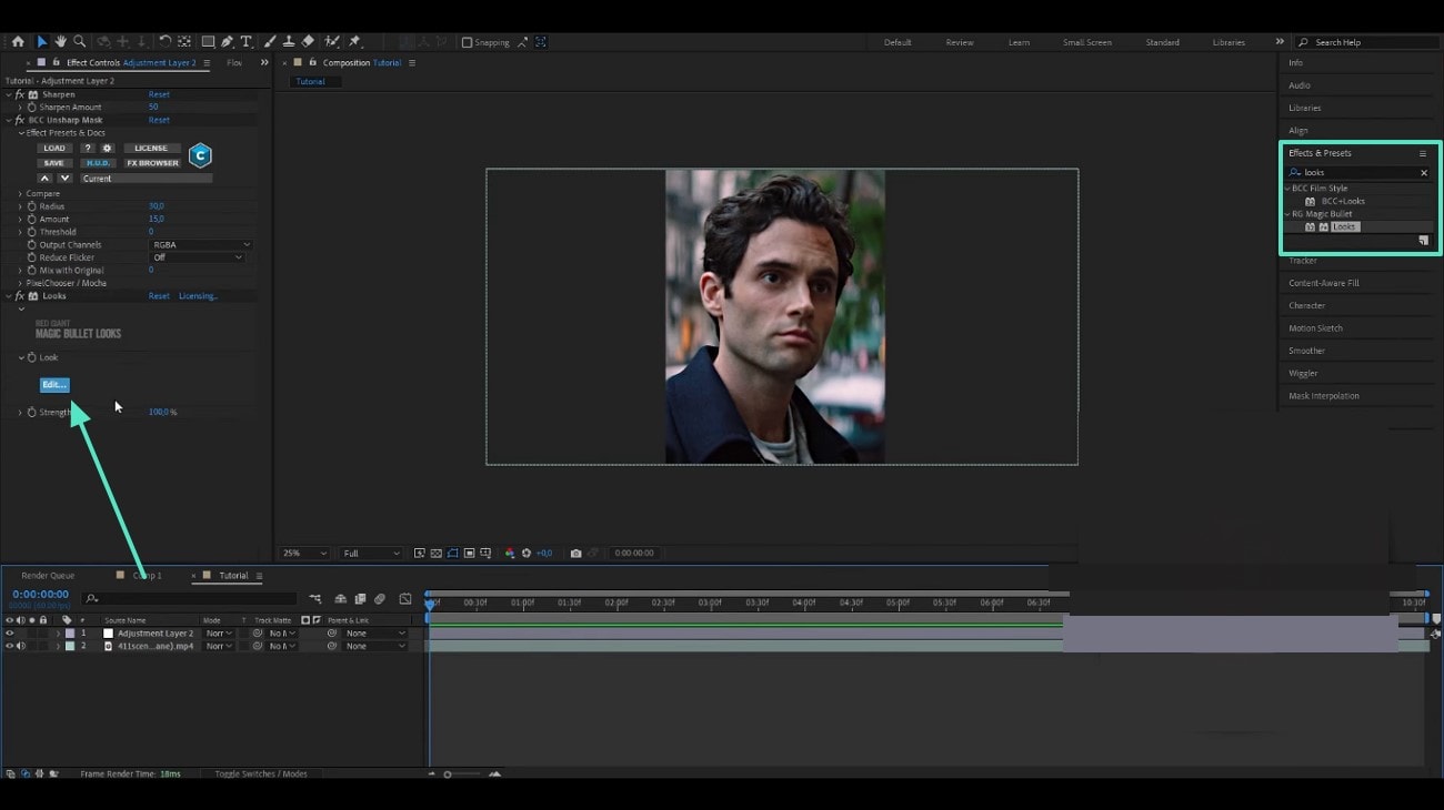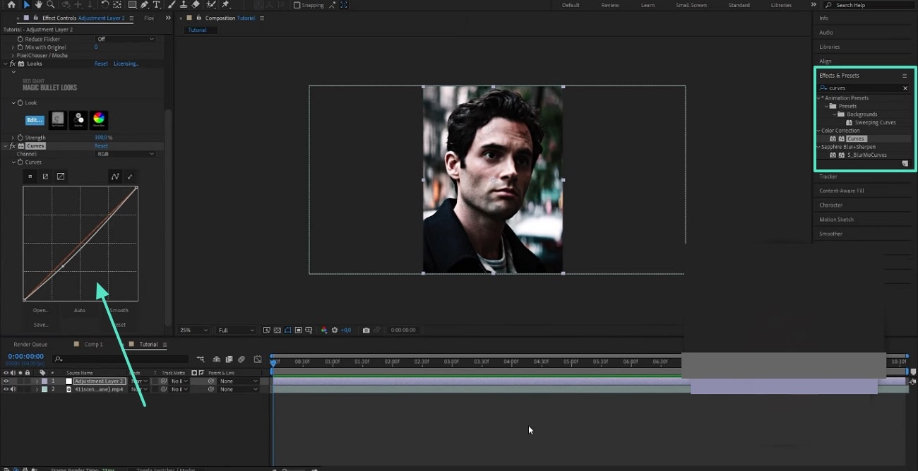 - Instructions : Une fois la vidéo importée dans After Effects, accédez à « Effets et préréglages » dans le panneau de droite. À l'aide de la barre de recherche, recherchez « Courbes » et ajustez la courbe manuellement sur le côté gauche.