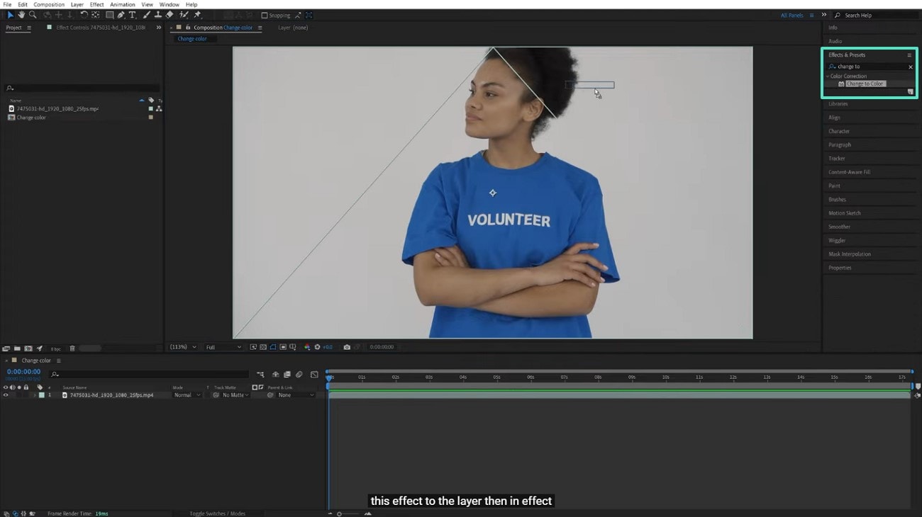 La méthode suivante consiste à ajuster manuellement les couleurs via le mélangeur de canaux. Cet outil permet d'ajuster les couleurs rouge, verte et bleue de la vidéo pour un rendu plus précis. Suivez les étapes ci-dessous pour apprendre à modifier la couleur d'un élément dans After Effects à l'aide de cet outil :