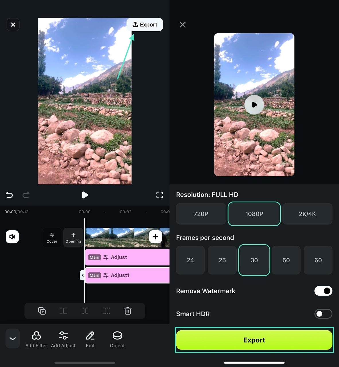 - Étape 6. Exportez la vidéo pour terminer le processus. Une fois la correction des couleurs terminée, appuyez sur le bouton « Exporter » en haut à droite pour enregistrer la vidéo à la résolution et à la fréquence d'images souhaitées.