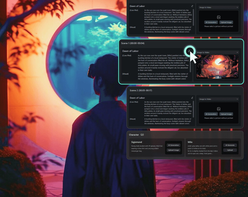 L'IA identifie les personnages principaux (noms, descriptions, miniatures d'avatar) à partir du storyboard. Générez-en de nouveaux avec des suggestions (« guitariste punk des années 80 ») ou importez les vôtres. Assurez-vous qu'ils soient cohérents dans toutes les scènes et vidéos..