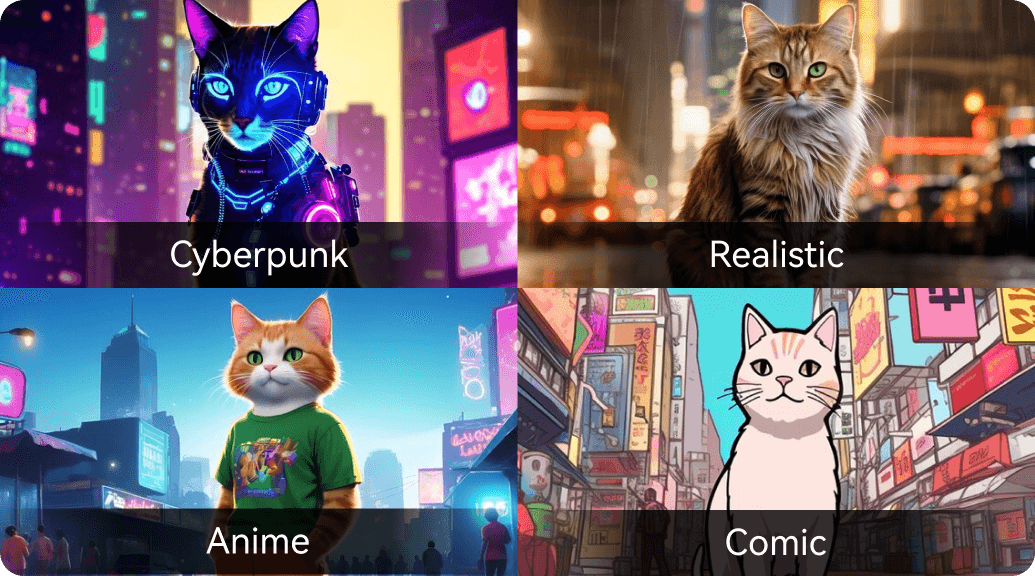Adaptez le ton de votre projet. Choisissez entre les styles Réaliste, Anime, Comic ou Cyberpunk : Réaliste pour les documentaires, Anime pour les aventures ou Cyberpunk pour la science-fiction. Mélangez les styles par scène pour des hybrides uniques.