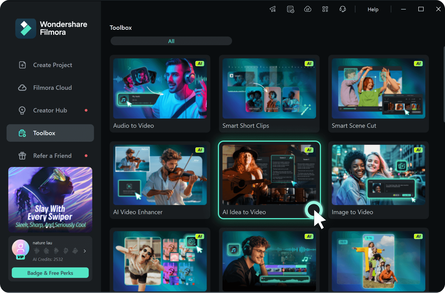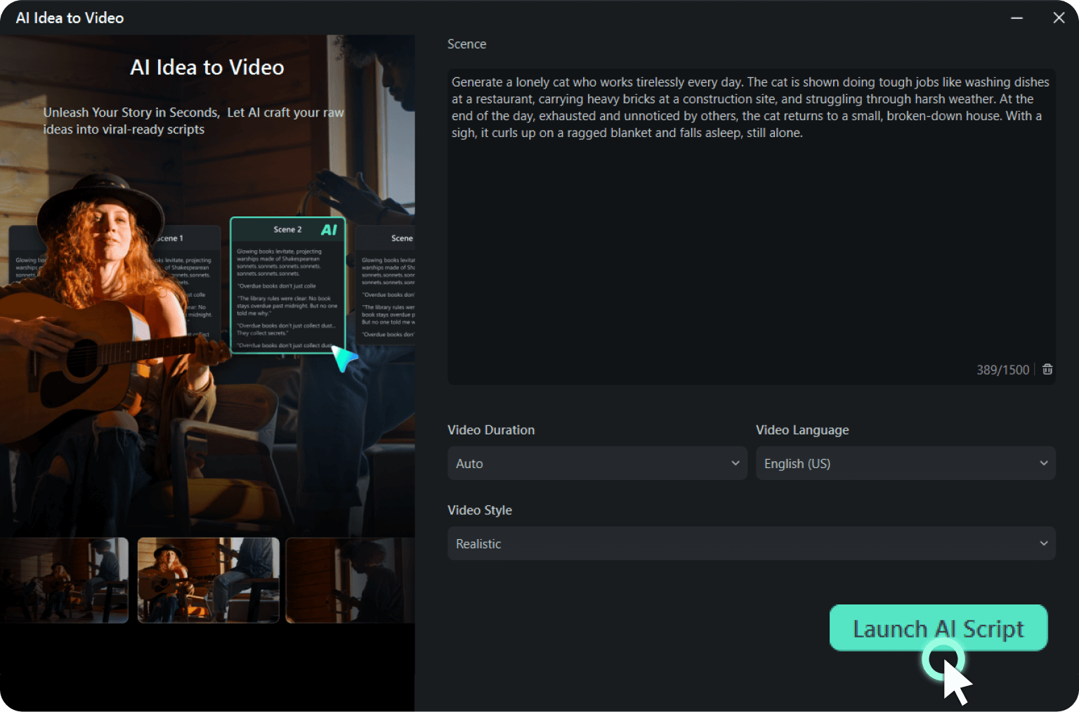 Téléchargez, installez et lancez Filmora. Ouvrez l'option « Idée en vidéo » depuis la boîte à outils et saisissez votre message (par exemple, « Un détective cyberpunk dans des rues éclairées au néon ») ou collez un script existant.. -
