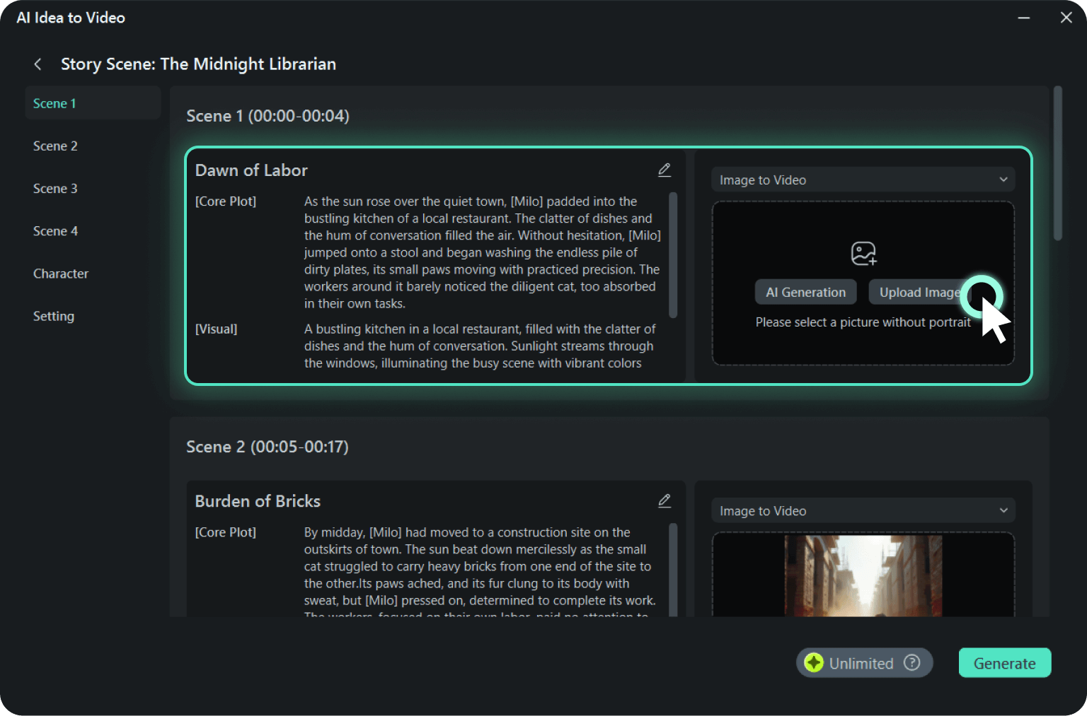 Modifiez le script, peaufinez les scènes ou modifiez les personnages. Recréez les visuels avec de nouvelles invites ou téléchargez des images de référence pour un meilleur contrôle. -