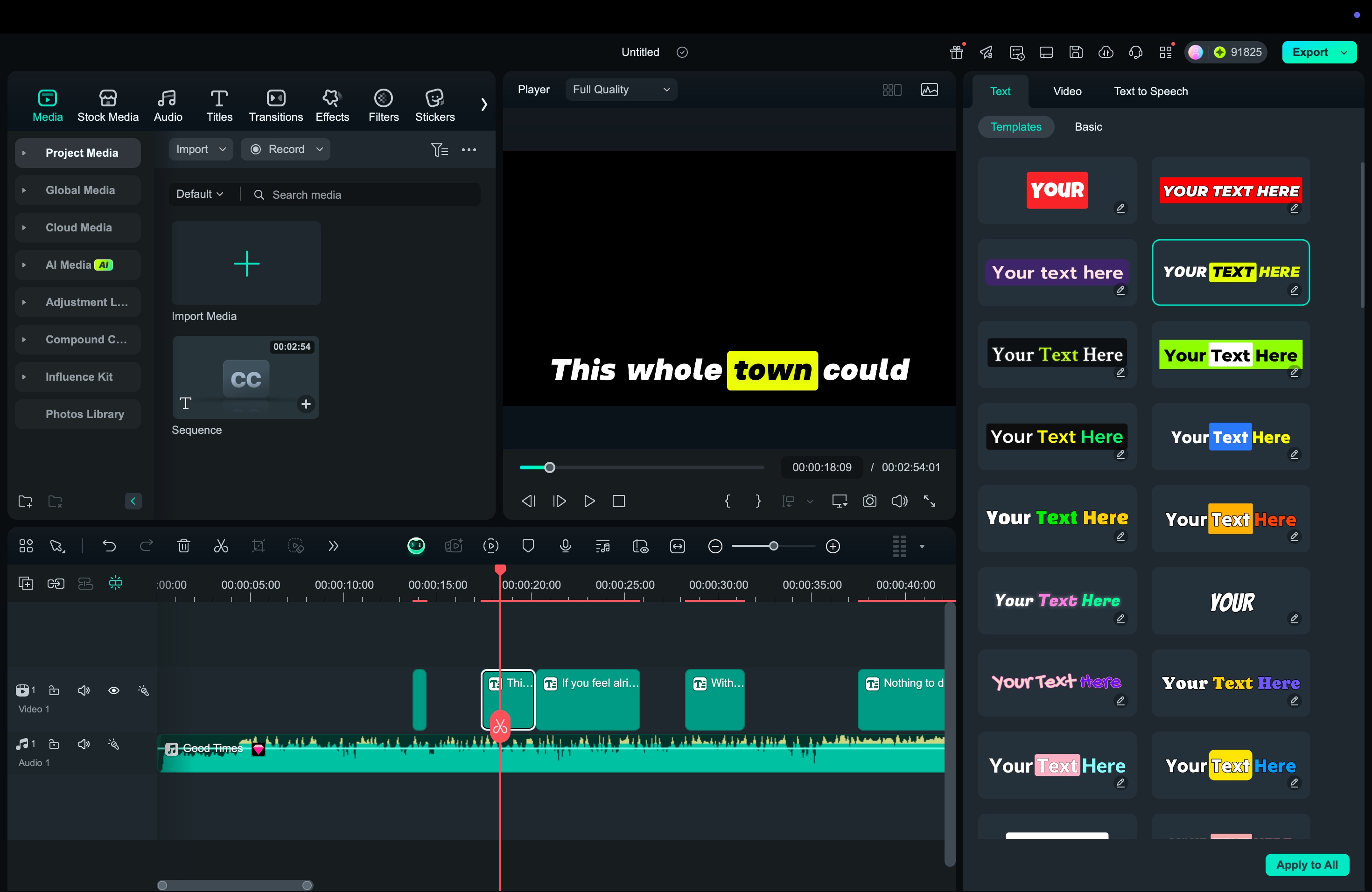 Utilisez Sous-titres dynamiques par IA pour générer automatiquement les paroles à partir de votre chanson, ou les saisir manuellement en utilisant l'outil Titre. Vous pouvez les synchroniser ligne par ligne ou mot par mot pour plus de précision.