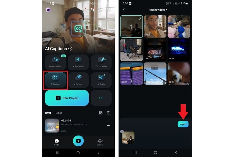 Ouvrez Filmora sur votre téléphone (Android ou iOS). Appuyez sur Sous-titres IA ou trouvez-le sous Plus. Choisissez votre vidéo dans la galerie et appuyez sur Importer pour la charger dans la timeline.