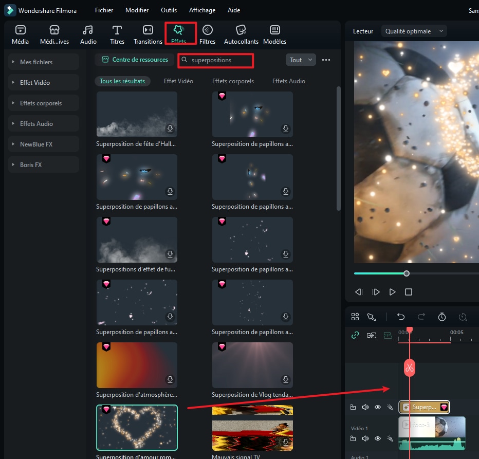 2 Passez votre souris sur l'effet de superposition que vous souhaitez. Lorsque vous téléchargez l'effet voulu, cet effet sera alors ajouté à la timeline après un clic sur l'icône Plus.