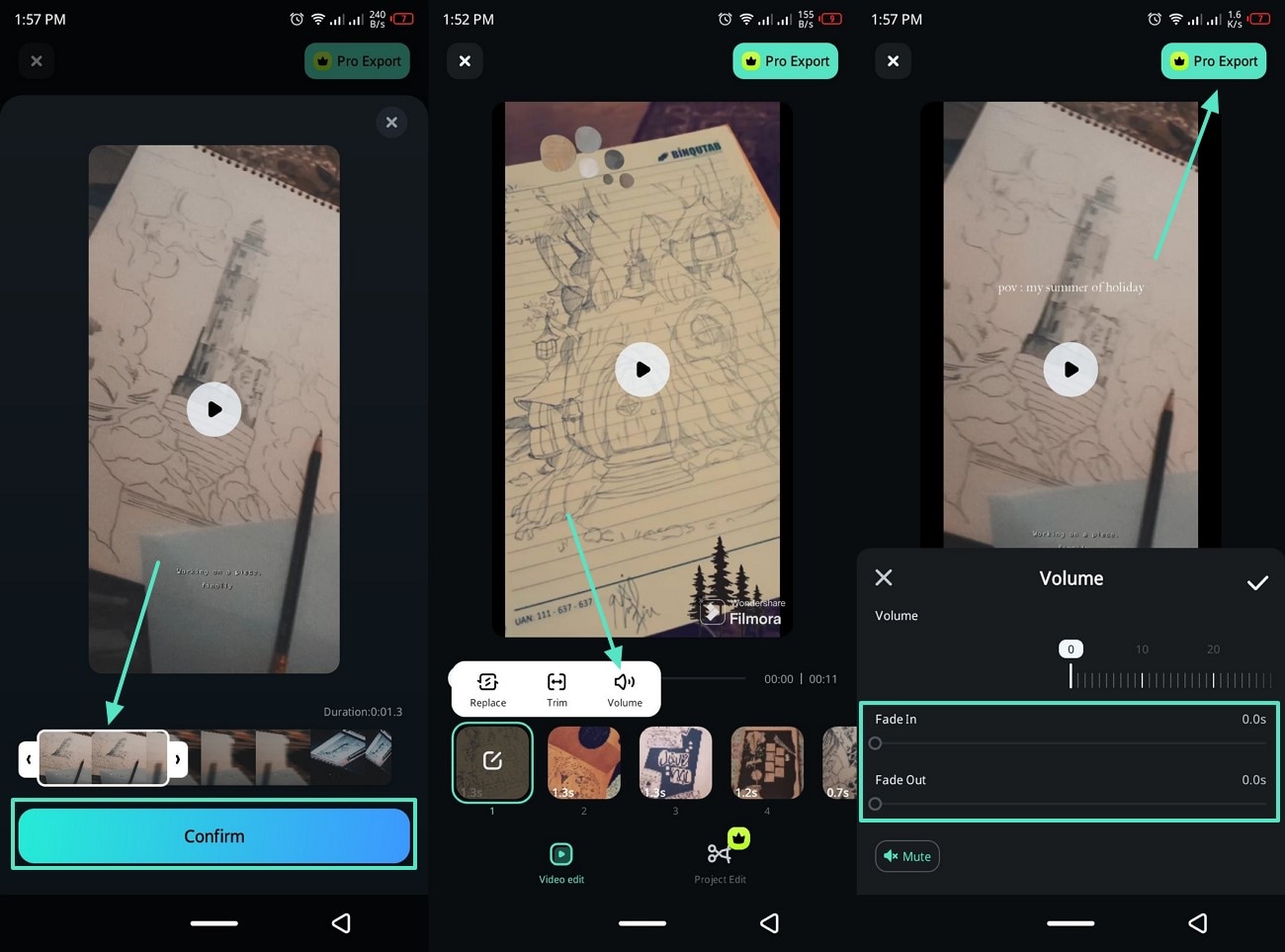 - Étape 2. Appliquer les modifications appropriées et exporter. Une fois le clip ouvert, faites glisser la zone sélectionnée vers la droite pour trouver le timing parfait, puis cliquez sur « Confirmer ». Choisissez ensuite l'option « Volume » et ajustez le son de la vidéo en modifiant les échelles de « Fondu entrant » et de « Fondu sortant ». Une fois satisfait, appuyez sur le bouton « Exporter » en haut pour enregistrer la vidéo sur votre appareil.