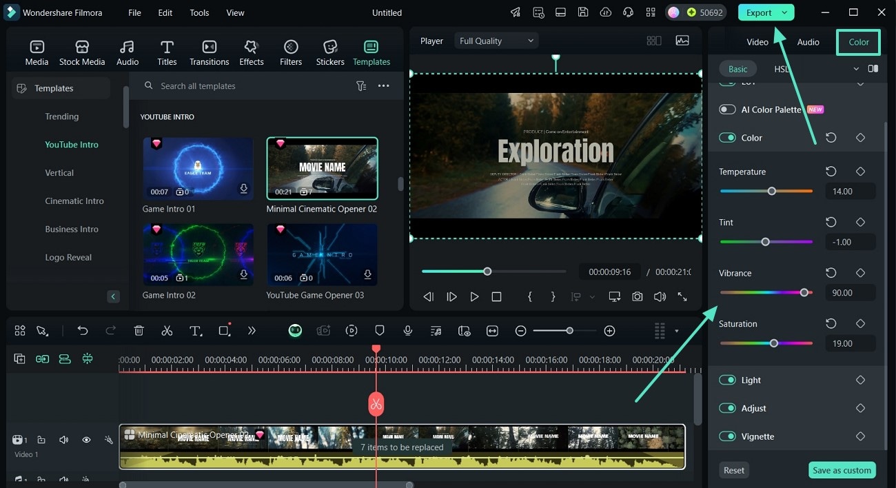 - Étape 4 : Effectuez les corrections colorimétriques et exportez. Dans l'onglet « Couleur », activez les options « Couleur », « Lumière » et autres pour accéder à leurs échelles. Faites-les glisser pour trouver l'harmonie de couleurs parfaite dans la vidéo. Lorsque vous êtes satisfait, cliquez sur le bouton « Exporter » en haut pour ouvrir une nouvelle boîte de dialogue.