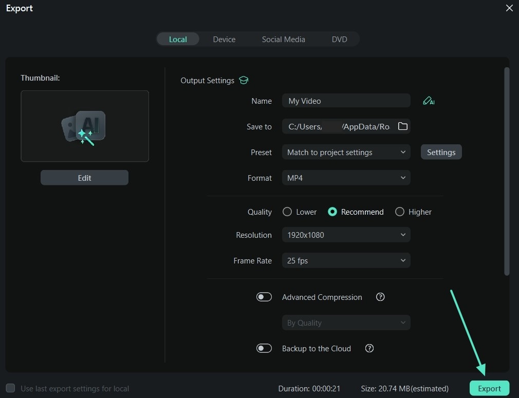 - Étape 5. Téléchargez la vidéo finale depuis Filmora. Une fois la boîte de dialogue « Exporter » ouverte, sélectionnez les options « Paramètres de sortie » appropriées, comme la qualité, la résolution et la fréquence d'images, puis appuyez sur « Exporter ».