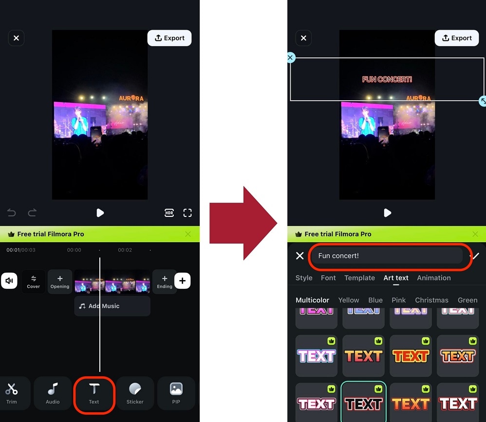 Étape 2 : Appuyez sur Texte dans la barre d'outils inférieure. Saisissez le contenu souhaité dans la zone de texte ci-dessous. Ensuite, explorez les outils de personnalisation de texte sous Style, Police, Texte artistique et Animation.